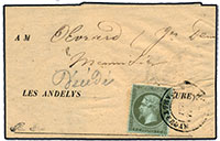 COCHINCHINE Ref#[1923] lettre frapée du très rare cachet à date HUE COCHINCHe / CORPS EXPd du 30 juillet 1884 à destination de CHARLEVILLE. quelques pièces vues. Desrousseaux FM13