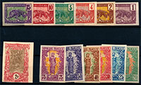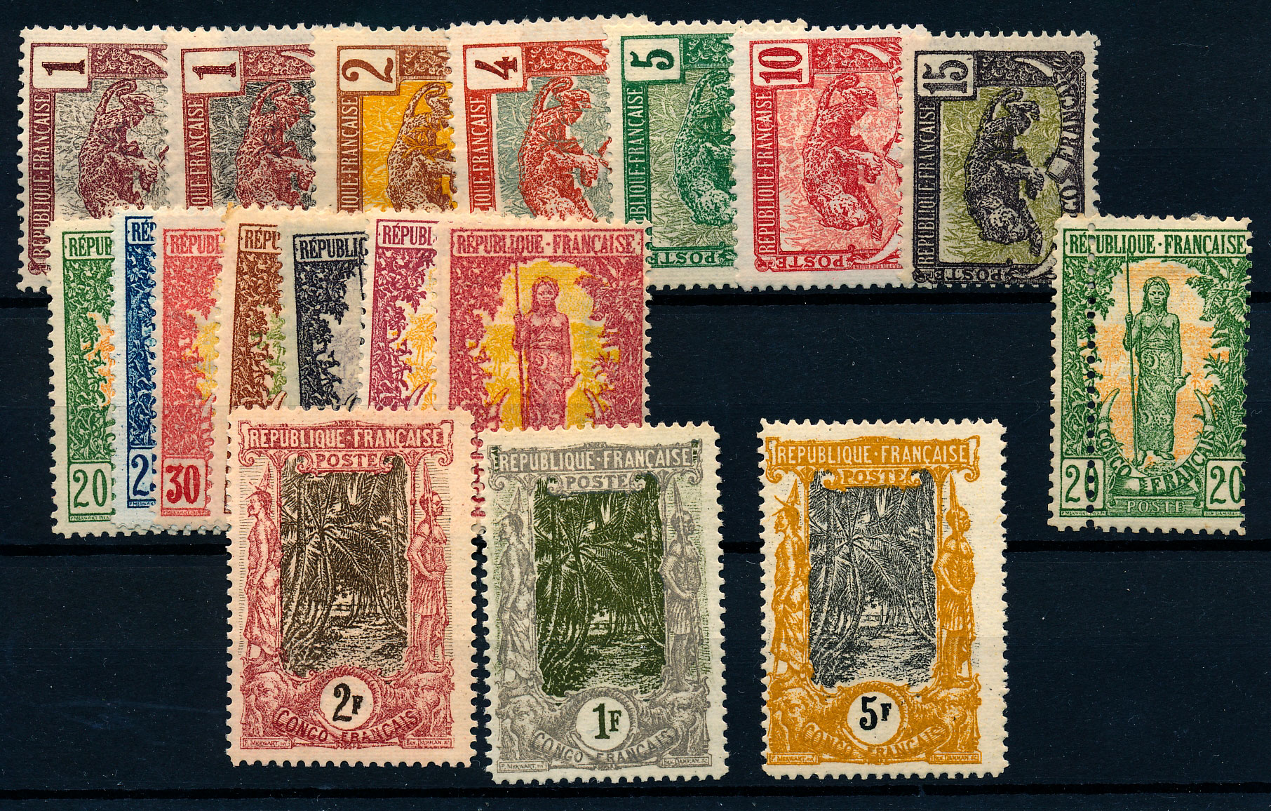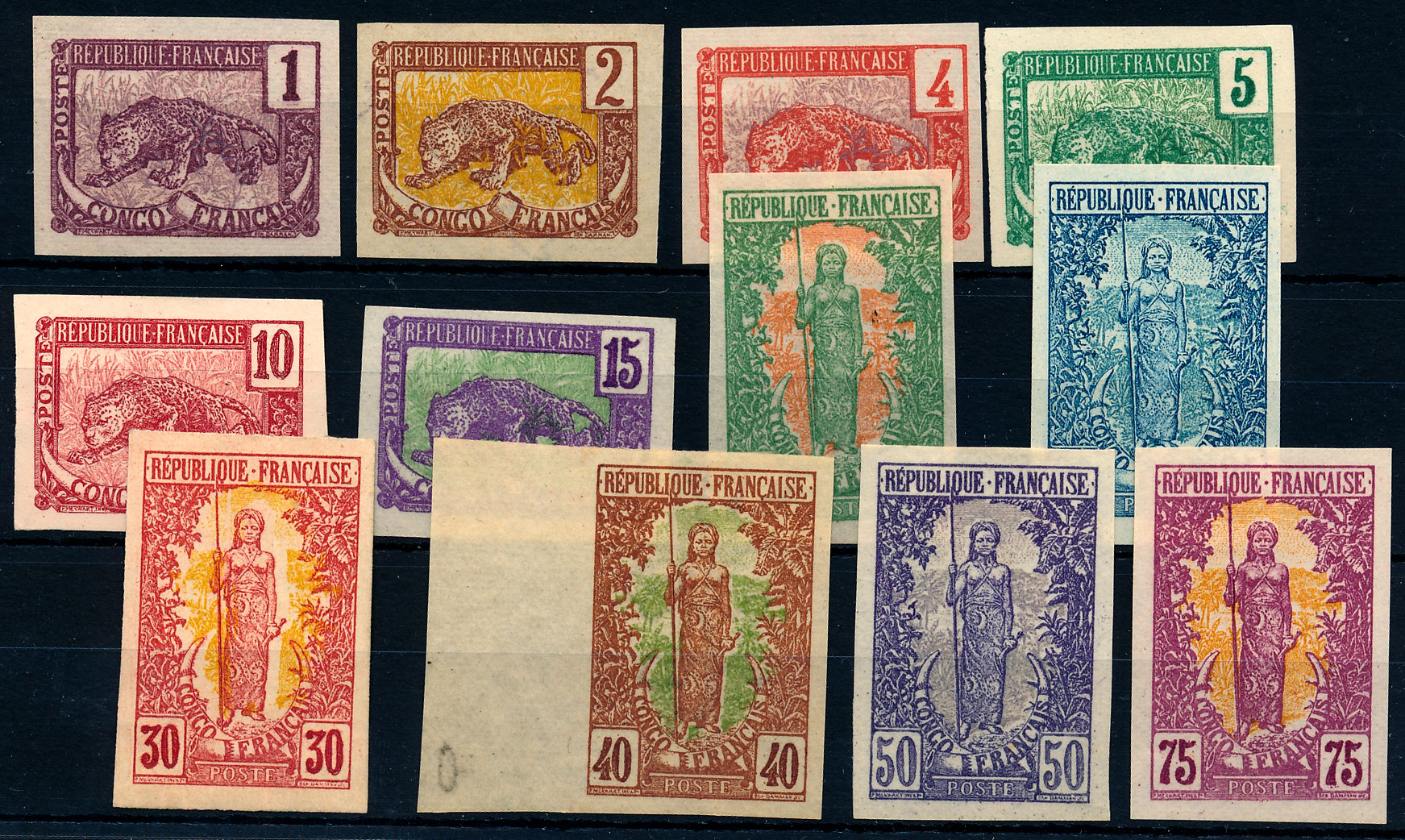 n°27/38 (*), les 12 valeurs Panthère et et femme Bakalois, en essai dans la couleur. TB