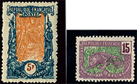 n°32+41 *, 2 essais de couleur, dentelés, 15c Panthère (*) et 5F avenue des Cocotiers avec gomme. TB