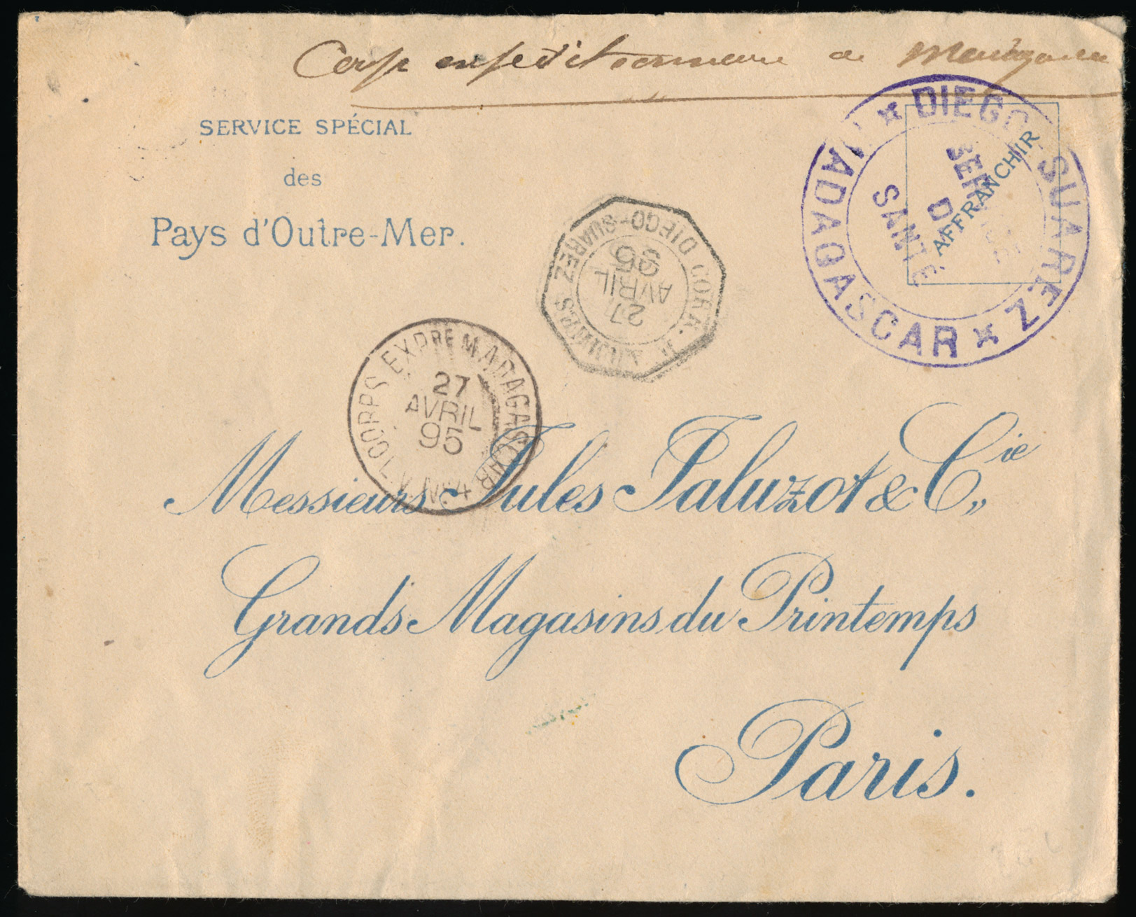 lettre en franchise militaire du CORPS D"OCCUPATION DE MADAGASCAR du 27 avril 1895 pour PARIS. Frappe du cachet DIEGO SUAREZ / SERVICE DE SANTE / MADAGASCAR recto et verso avec paraphe du vaguemestre