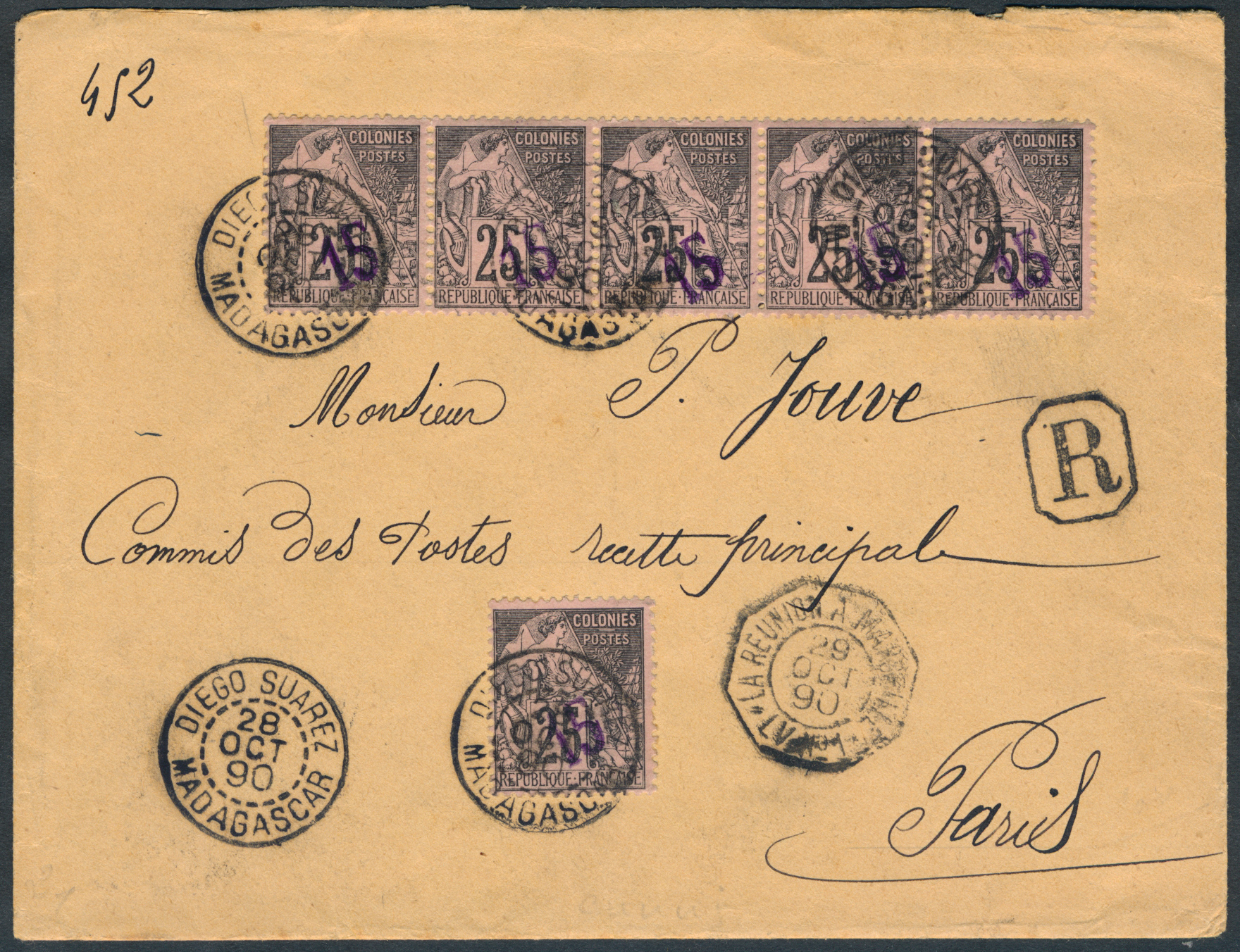 n°5 , 15 sur 25c noir sur rose, 6 exemplaires sur lettre recommandée du 28 oct 90 à destination de PARIS, TB