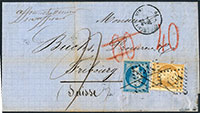 ALGERIE Ref#[1858] lettre de BOUFFARIK du 10 juin 1857 à destination d"AGDE. bel affranchissement avec une paire de 20c empire oblitéré du PC 3717 (faible). pli d"archive sinon TB