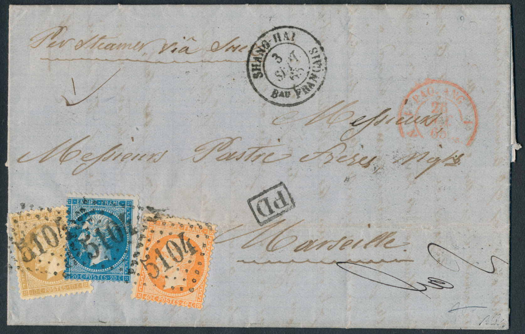 n°3231 , 40c et 80c lauré (def) oblitérés GC 5104 sur lettre de SHANGHAI du 22 mars 1870 à destination de BERLIN. destination rare