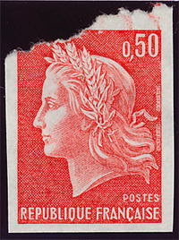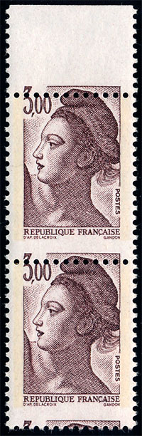 n°2714 **, 2,20 Marianne du Bicentenaire de Louis Briat, issue de TD6, présentant 2 bandes verticales non dentelé accidentel tenant à normal, provenant de la seule feuille connue avec cette présentation ; nota : les ND officiels sont issus de RGR et peuvent ëtre différenciés des TP non dentelés issus de ce bloc