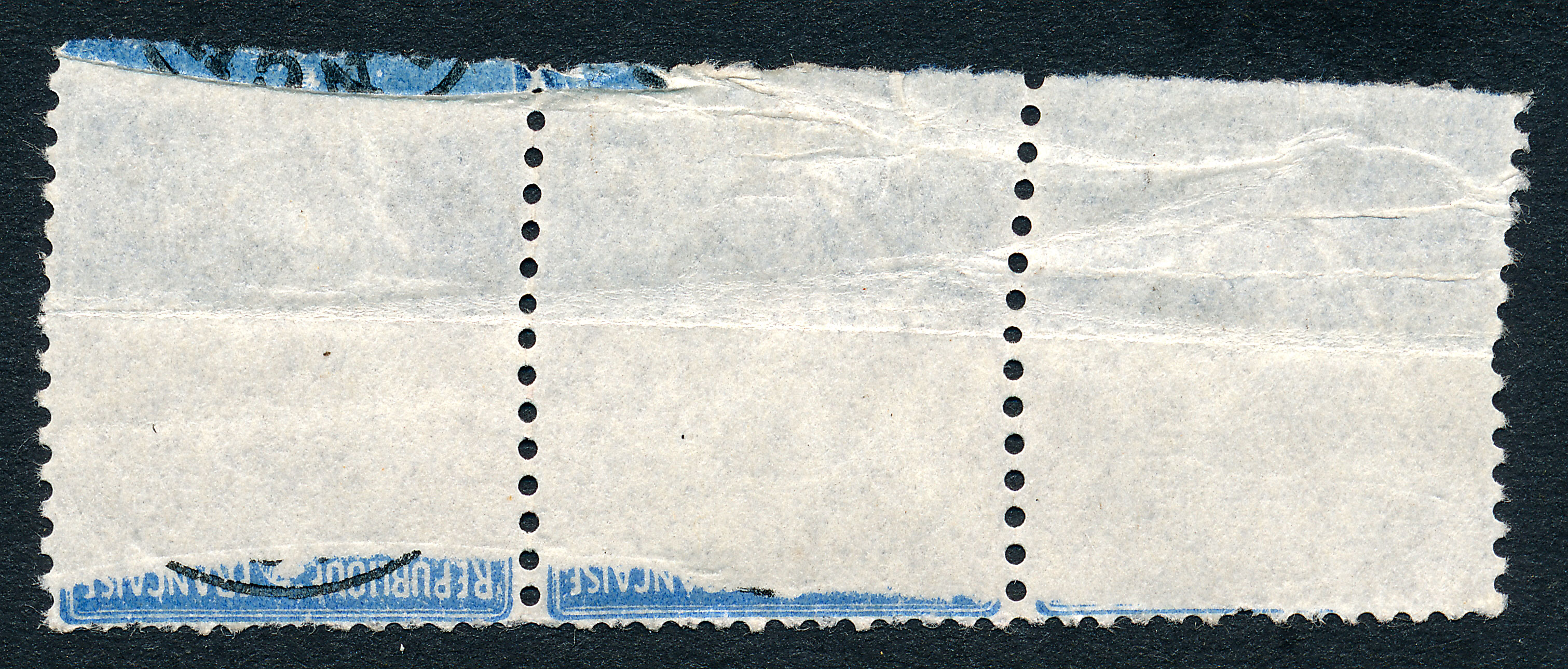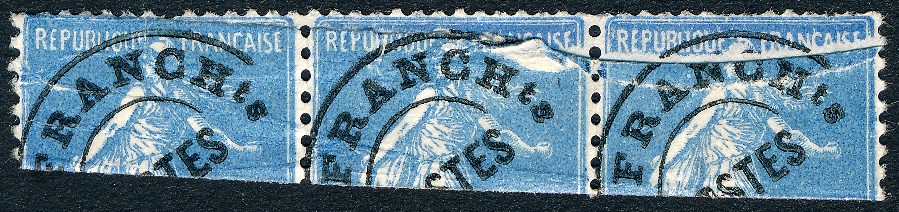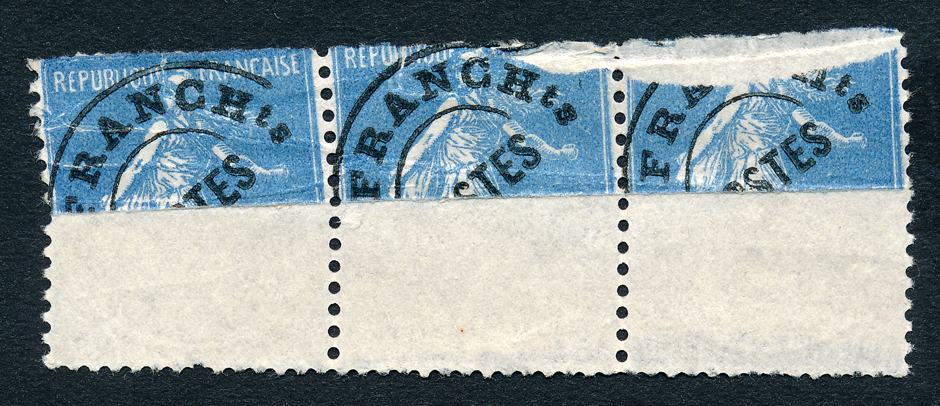 n°56 (*), 20c bleu, bande de 3 impression sur raccord plié. spectaculaire et unique
