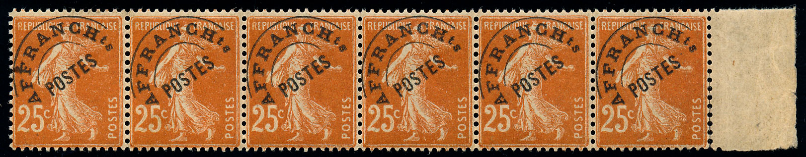 n°47 **, 25c semeuse jaune brun, PREOBLITERE, n°57a, bande de v6. neuf avec gomme d"origine intacte. superbe.