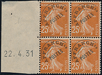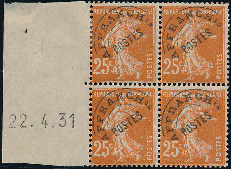 n°57 *, 25c Semeuse jaune brun, bloc de 4 avec date à gauche, 22.4.31. superbe.