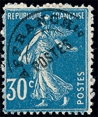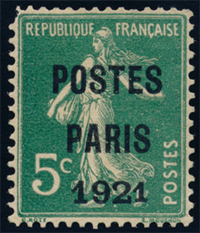 n°26d , 5c vert foncé, surcharge POSTE PARIS 1921, variété gros 192. très rare. une dent manquante.