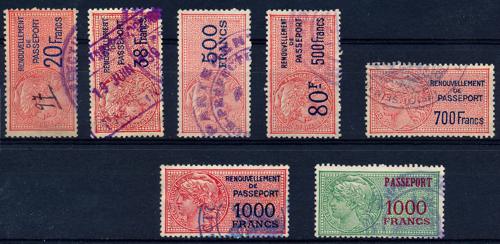 n°3+5+7+10+12+13+15 , 7 timbres 20F à 1000F. TB dans l"ensemble