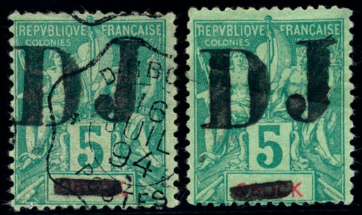 n°1 , 5c vert surchargé DJ _. un exemplaire neuf avec gomme mais fort pli, un exemplaire oblitéré, TB