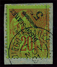 n°12a , 5c sur 20c brique sur vert, surcharge renversée sur support. TB.