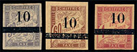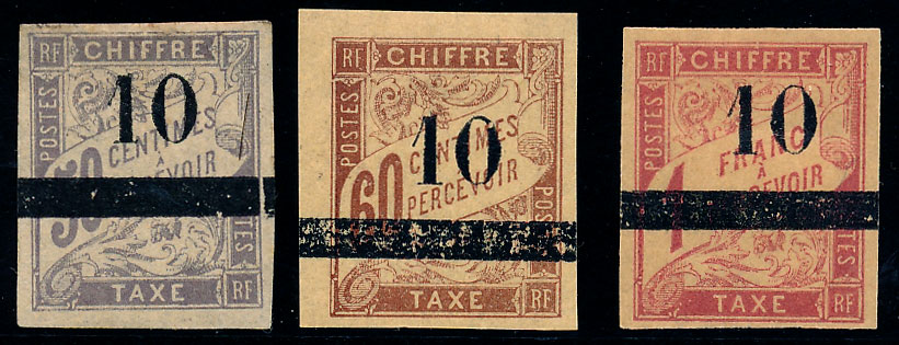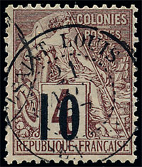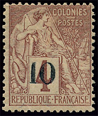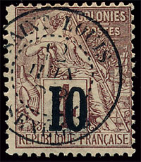 n°3 *, 10 sur 4c lilas-brun sur gris, surcharge type I, sans la queue. TB