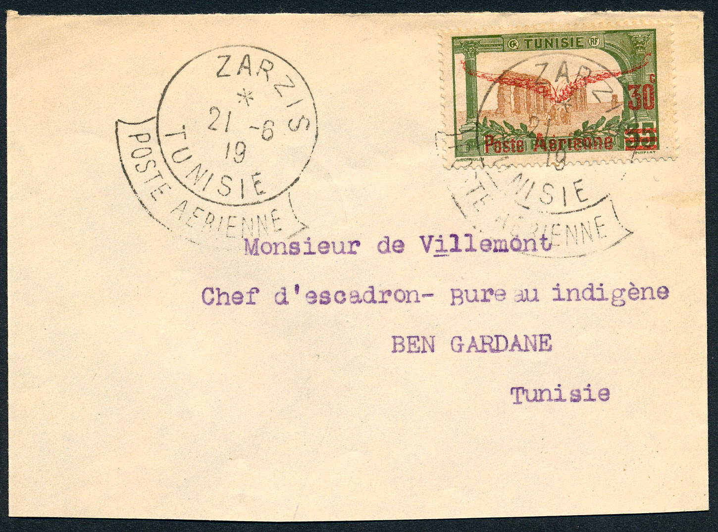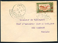 n°1 , 30c sur 35c vet olive et bun sur lettre de ZARZIS/POSTE AERIENNE pour BEN GARDANE/POSTE AERIENNE par service postal aérien 21-06-1919. TB
